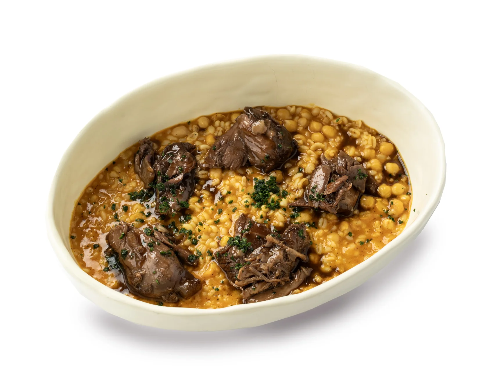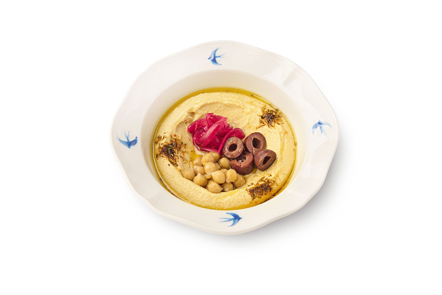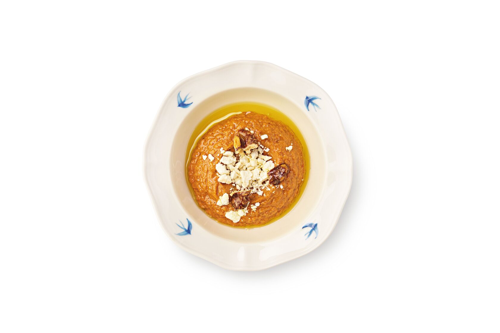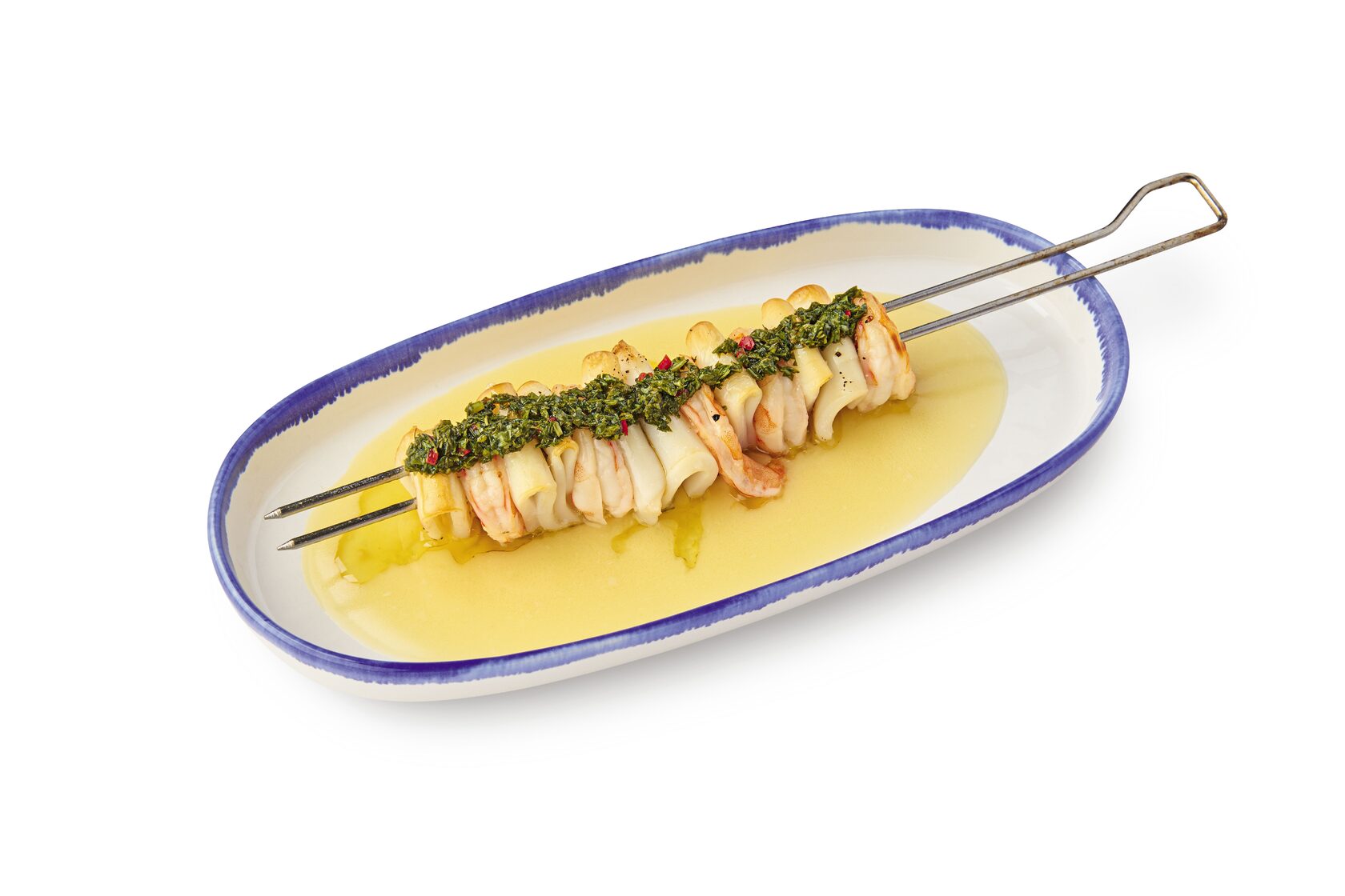 Марроканский осьминог с хумусом, печёным томатом и соусом лемон баттер